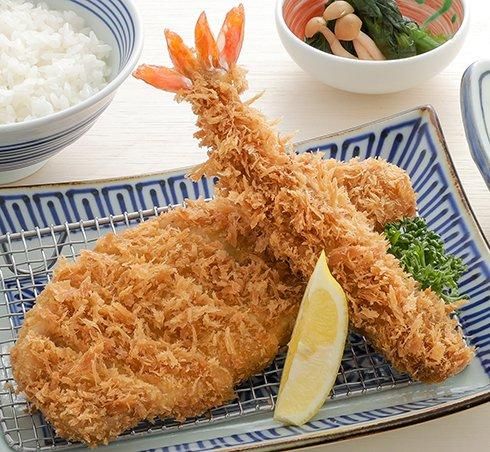 海老本来の味を活かしたこだわりの大海老フライと、脂身が甘くコクのある三元豚ロースかつ、そしてさっぱりとしていながらやわらかで肉汁たっぷりのヒレかつのセット。