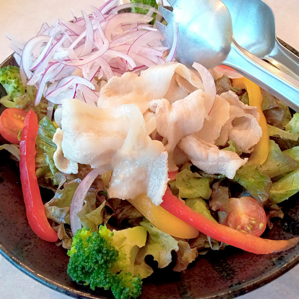 三代目まるやま豚はお肉の旨味が濃いので、たっぷりのお野菜と一緒でも充分美味しくいただけます。